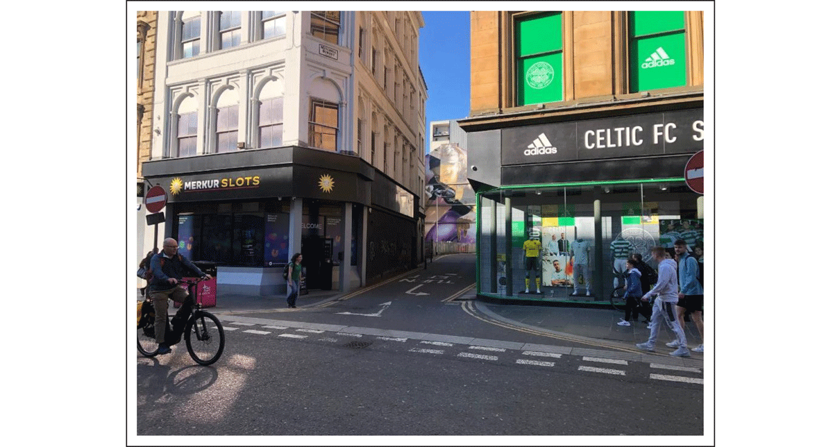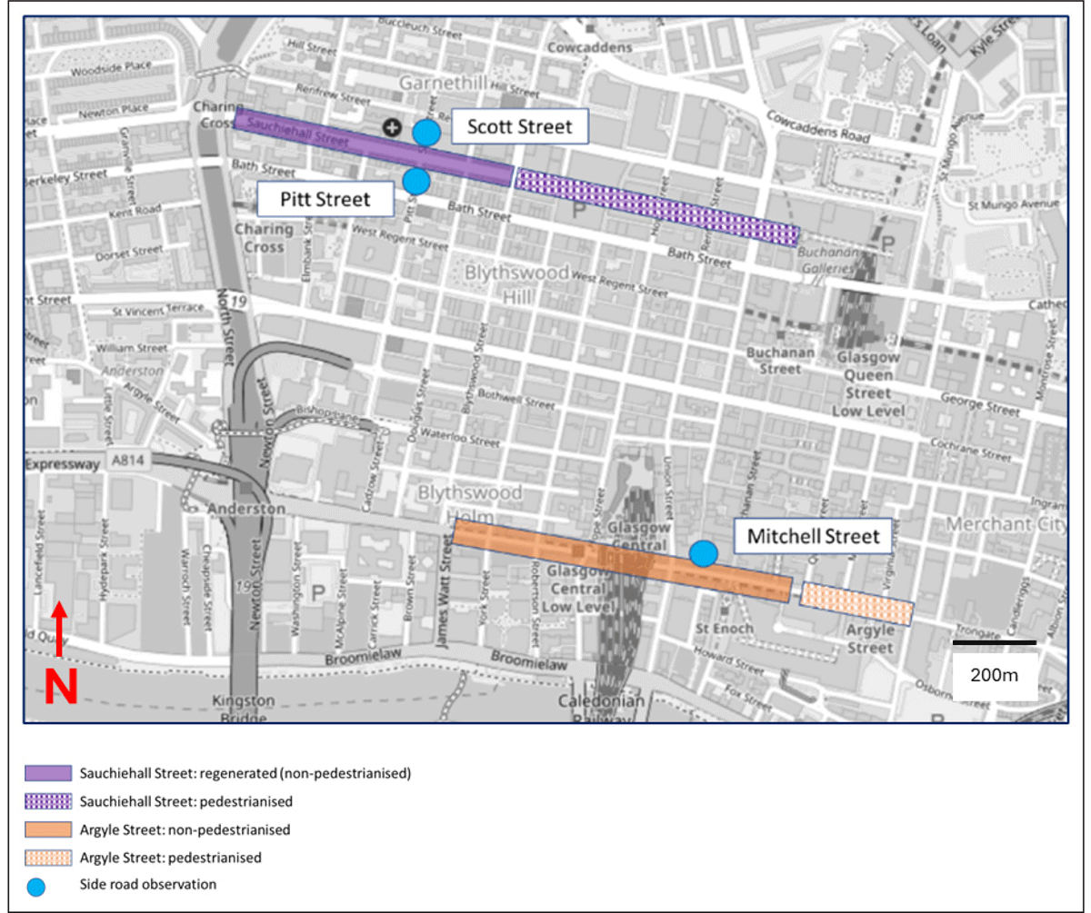 Observations took place at three sites (Figure 1): two on Sauchiehall Street (Scott Street and Pitt Street) and one control site on Argyle Street (Mitchell Street). Scott Street also features a continuous cycle track across the junction, whereas Pitt Street on the south side has no specific cycling provision (Figure 2).
