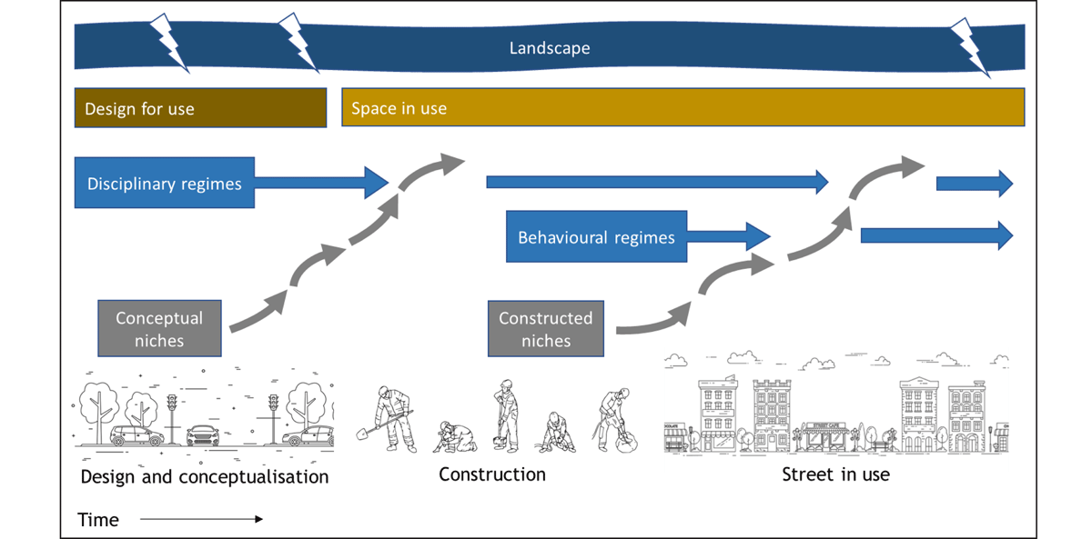 Regimes acting to constrain the design and conceptualisation process can be summarised as ‘disciplinary regimes’, i.e. those embedded within the praxis of each specific discipline, such as engineering. Once constructed, the niches (continuous footways) then continued to exert pressure on these disciplinary regimes, but they also exerted pressure on what are termed ‘behavioural regimes’, i.e. the behaviours of the people using the street. The identification in this research of the two types of regimes (disciplinary and behavioural) operating in this context, as well as the two categories of niches (conceptual and constructed), forms a conceptual update to STT theory. Furthermore, an additional finding using this framework was that the mere concept of continuous footways could already be seen exerting some pressure on the existing disciplinary regimes, even before planning and construction. This points to the importance of appointing a ‘knowing’ project manager who can anticipate and manage the implications of potentially conflicting regimes at a sufficiently early stage of a project to avoid challenges later on.