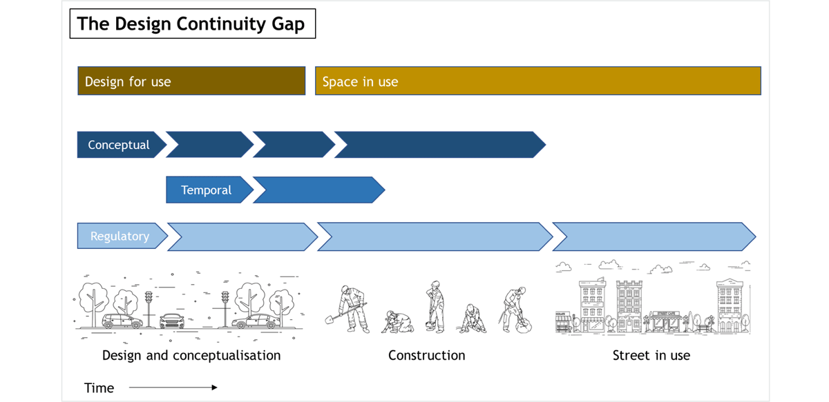 Framing the events of the design process, including the actions of the highways engineers, in STT terms, offers new insight into how similar projects might be managed in the future. This research identified the existence of several ‘gaps’ inherent in a project of this kind where the concept is developed in-house by a local authority, passed to an external design team who draw up initial designs before passing the designs back to the local authority who can then make further changes, or indeed invite further external input. This potentially produces what has been termed in this research a design continuity gap (Figure 11), within which there is a conceptual design gap where project officers, such as highways engineers, may not be on board with the philosophical intent behind a design (e.g. to change the established priority of people driving and walking at side roads). There is also potentially a temporal design gap whereby the urban design consultants relinquish agency over a project when it is taken back ‘in-house’. In this case, the design continuity gap appeared to have been worsened by a regulatory design gap, whereby the design standards that might have provided the Senior Highways Engineer at GCC with a secure basis for accepting the proposed design were not published until after the project had taken place. Despite these being knowingly ‘in the pipeline’, this was not sufficient for a profession heavily bound by standards and risk mitigation. An awareness amongst project managers from the outset of these potential gaps in future project work may help to mitigate the effects.