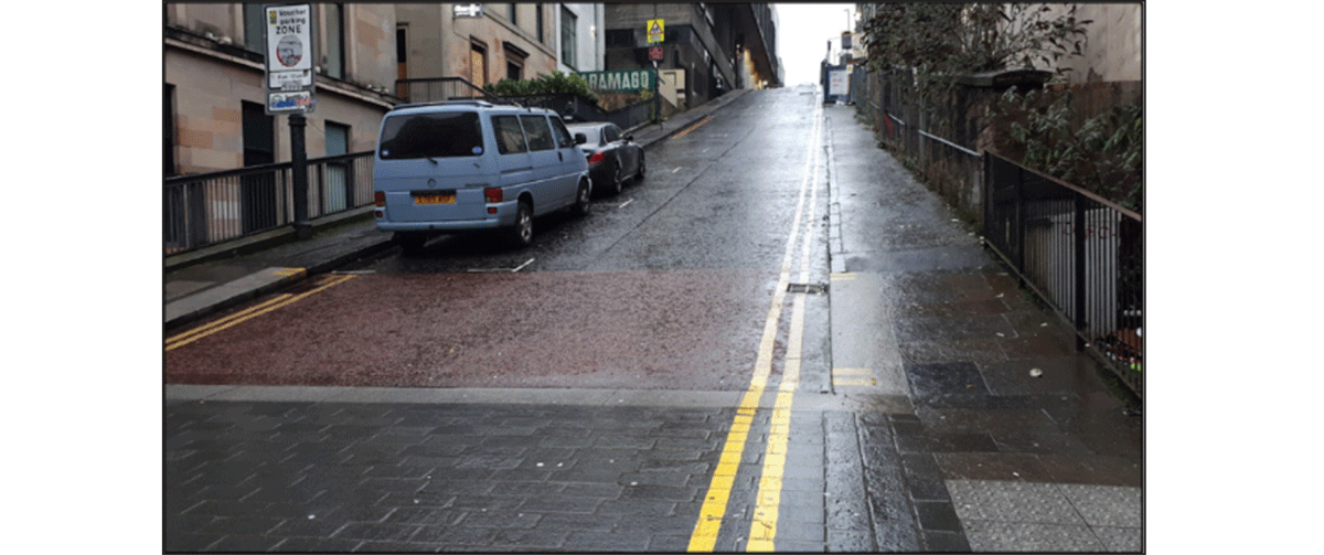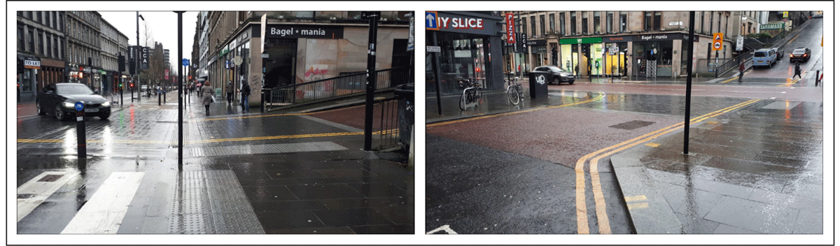 Mitchell Street on Argyle Street was selected as a control (Figure 3). It is a single lane side road with vehicles travelling one-way towards Argyle Street, i.e. turning out of the junction. The side road presents visually as a traditional crossing with a clear distinction between the granite footway and black tarmac carriageway, although there are no kerbs, so the whole surface is flush. Argyle Street is also a mixed-use street within Glasgow city centre with pedestrianised and non-pedestrianised sections, like Sauchiehall Street.