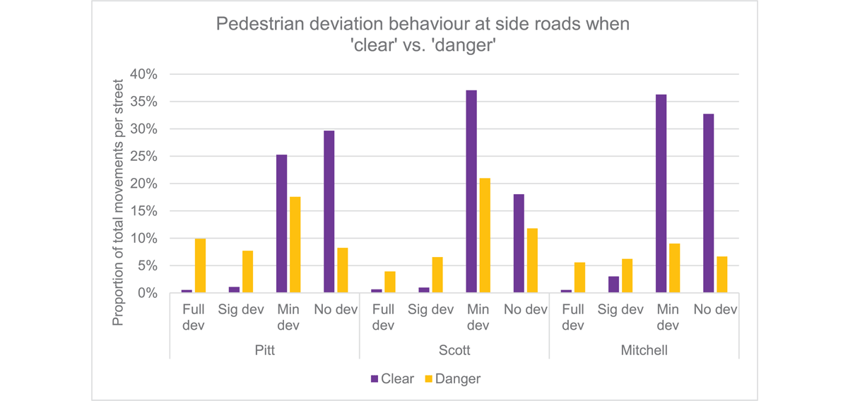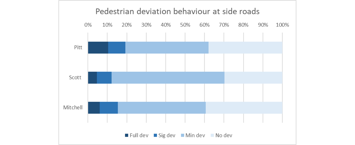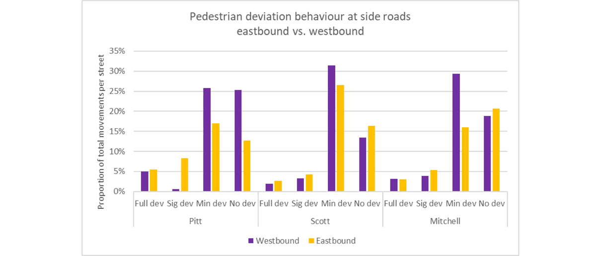 It was hypothesised that individuals walking westbound would be more likely to show ‘no’ or ‘minimal’ deviation behaviour on Pitt Street and Scott Street due to being able to see oncoming traffic. Argyle Street is also one-way eastbound, but vehicles are turning out, so it was hypothesised that there should not be a difference between the directions at Mitchell Street. Figure 8 shows the results of this analysis.