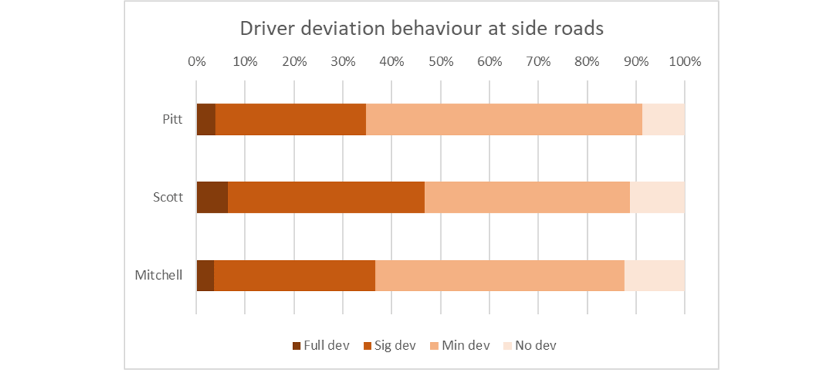 On Scott Street, behaviour is more mixed with slightly more people showing ‘minimal’ deviation behaviour westbound, but more people showing ‘no’ deviation behaviour eastbound. This supports the theory that this side road is more visually complex and therefore does not communicate as clearly in either direction as Pitt Street. The increased complexity of the design is perhaps diluting or dispersing the pressure that can be exerted on the regime. Mitchell Street, as predicted, shows mixed results across each category, except for ‘minimal’ deviation behaviour.